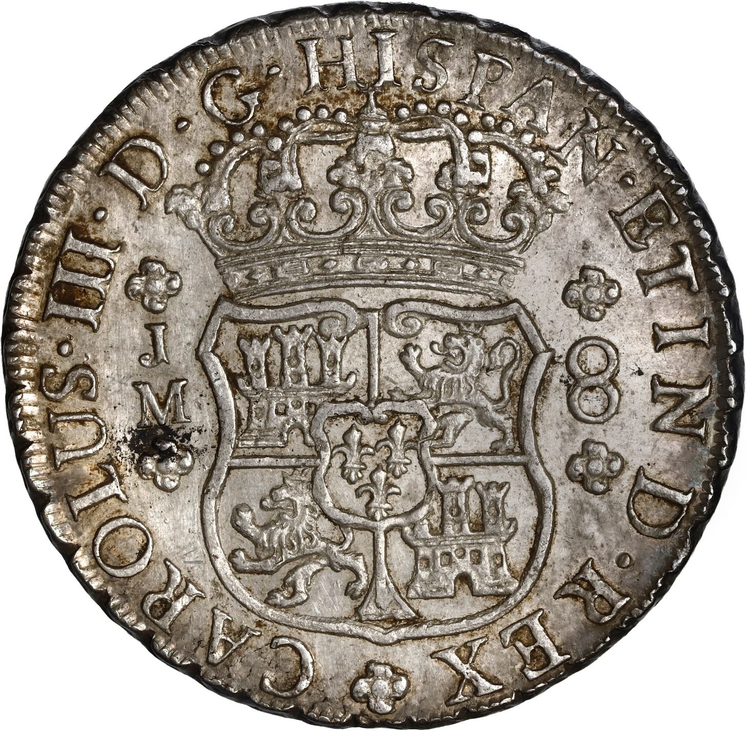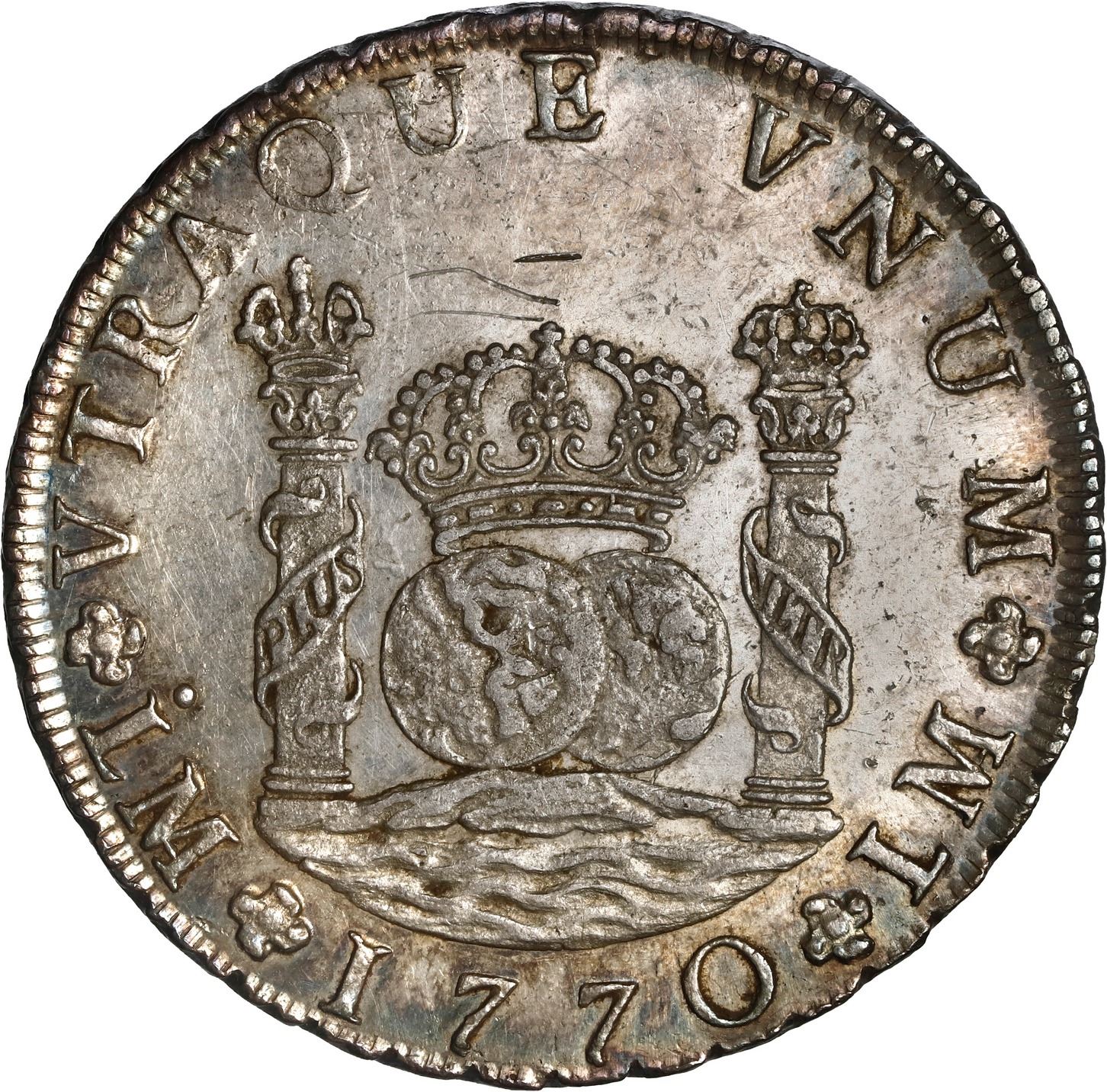PERU, Lima, pillar 8 reales, Charles III, 1770 JM, no dot over right mintmark, ex-Brameld. Yonaka-L8.70; Cal-unl (cf 1031); KM-64.2. 26.86 grams. AU+ with some light rainbow toning over choice luster, a few minor marks and hairlines. (Note: Calicó does not differentiate the mintmark varieties for this type.). Pedigreed to the David Brameld Collection.