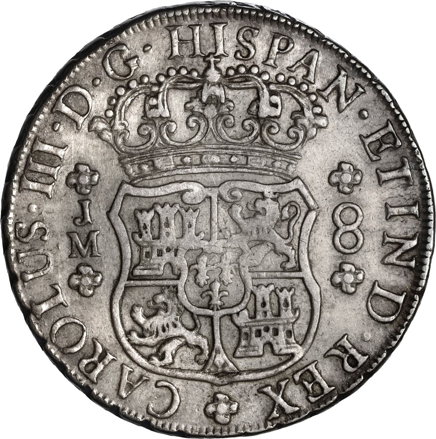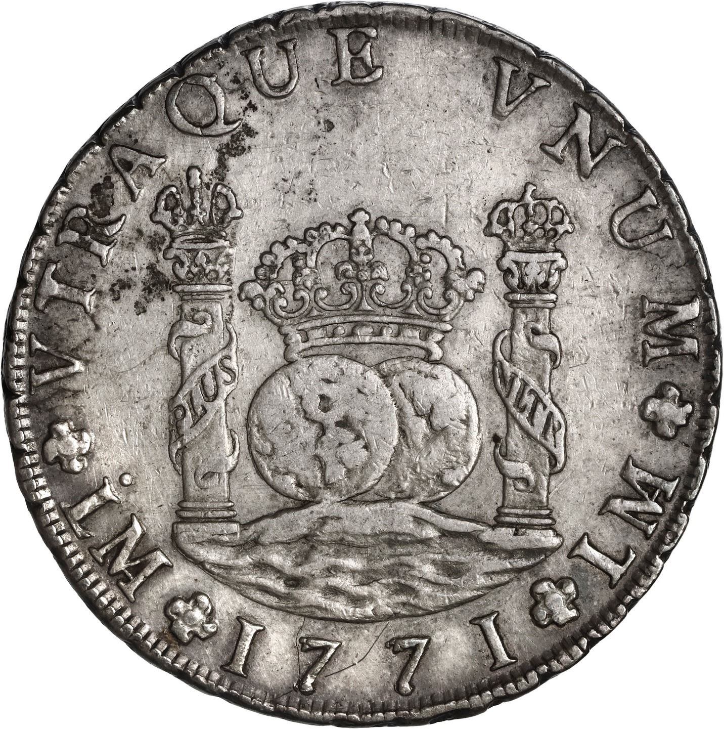 PERU, Lima, pillar 8 reales, Charles III, 1771 JM, no dot over right mintmark, ex-Brameld. Yonaka-L8.71; Cal-unl (cf 1032); KM-64.2. 26.88 grams. Very lightly toned AXF with old hairlines and a few marks. (Note: Calicó does not differentiate the mintmark varieties for this type.). Pedigreed to the David Brameld Collection.