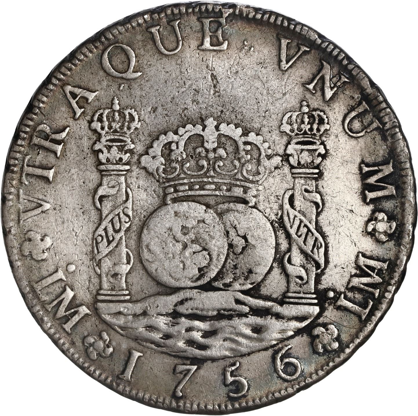 PERU, Lima, pillar 8 reales, Ferdinand VI, 1756/5 JM, ex-Brameld. Yonaka-L8.56a; Cal-461; KM-55.1. 26.76 grams. AXF with traces of toning and black sediment in crevices, faint surface porosity, clear overdate (rated as scarce in Yonaka). Pedigreed to the David Brameld Collection.