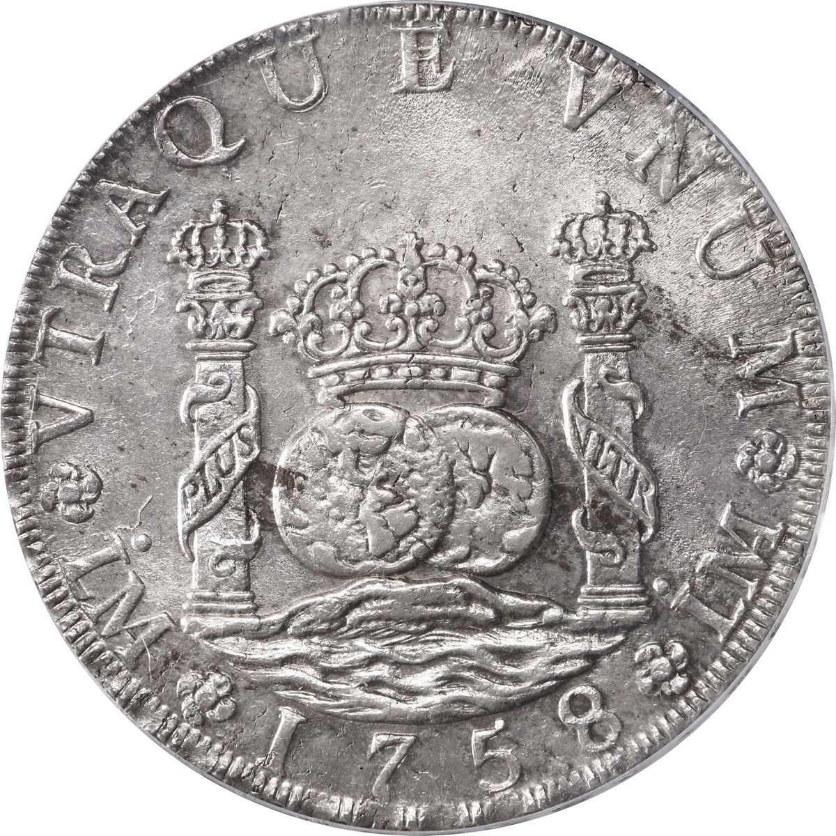 PERU, Lima, pillar 8 reales, Ferdinand VI, 1758 JM, PCGS MS61. Yonaka-L8.58; Cal-466; KM-55.1. Very bold strike with full rims, nice luster, minor surface porosity (as made) and a couple tiny dark spots, choice grade (second finest in the PCGS census behind a single MS 62).