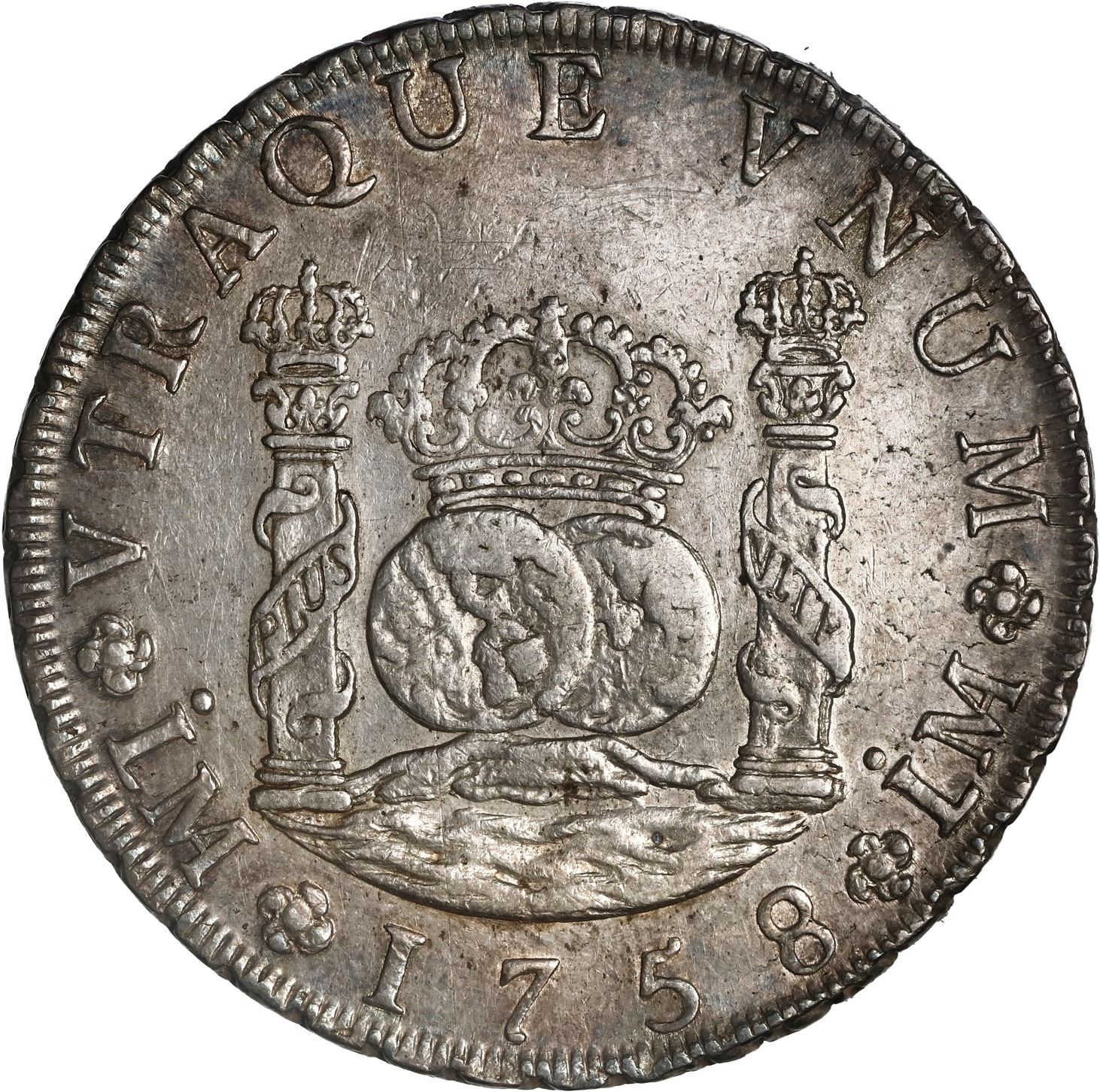 PERU, Lima, pillar 8 reales, Ferdinand VI, 1758 JM, ex-Brameld. Yonaka-L8.58; Cal-466; KM-55.1. 26.96 grams. AU- with decent luster, rainbow toning at rims, some marks and light hairlines. Pedigreed to the David Brameld Collection.