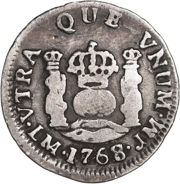 PERU, Lima, pillar ½ real, Charles III, 1768/7 JM, extremely rare, ex-O'Brien. Yonaka-L05.68b; Cal-121; KM-unl (60 for type). 1.60 grams. Off-center Fine with nice toning, light marks, rated R4 in Yonaka, who observed only one example (not this one). Pedigreed to the John O'Brien Collection, with his tag.