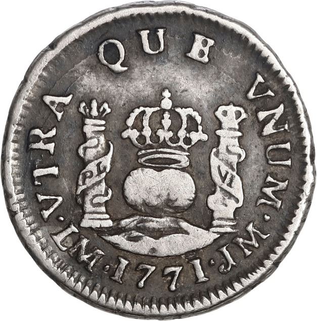 PERU, Lima, pillar ½ real, Charles III, 1771 JM, mintmark with MA ligature, very rare, ex-O'Brien. Yonaka-L05.71a; Cal-125; KM-60. 1.68 grams. Bold VF with deep contrasting toning, parts of rims slightly crude (as made), rated R2 in Yonaka. Pedigreed to the John O'Brien Collection, with his tag.