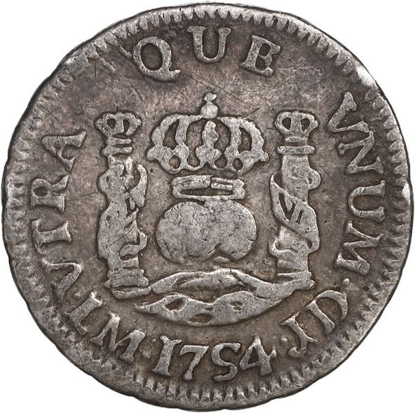 PERU, Lima, pillar ½ real, Ferdinand VI, 1754 JD, ex-O'Brien. Yonaka-L05.54; KM-51; Cal-53. 1.63 grams. This is probably the scarce "dotted mintmark" die, even though the dot is too weak to be discerned, as is also the crossbar inside the M of the mintmark (which Gilboy called normal M). VF with a few old marks in the richly toned fields. Pedigreed to the John O'Brien Collection, with his tag.