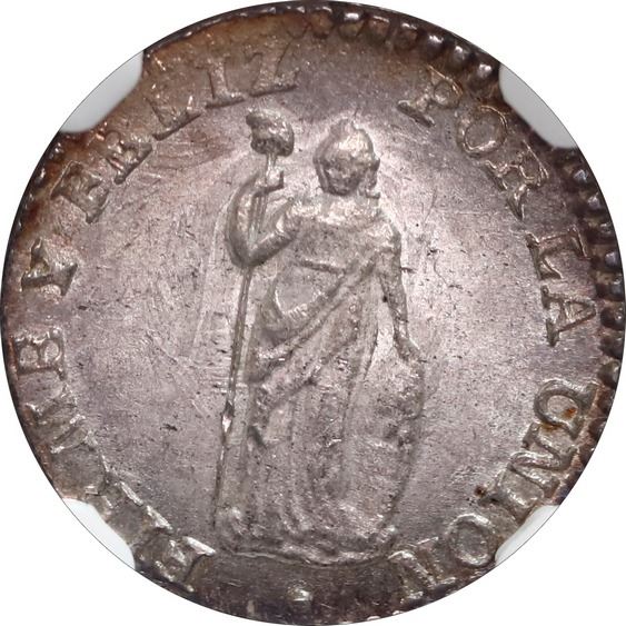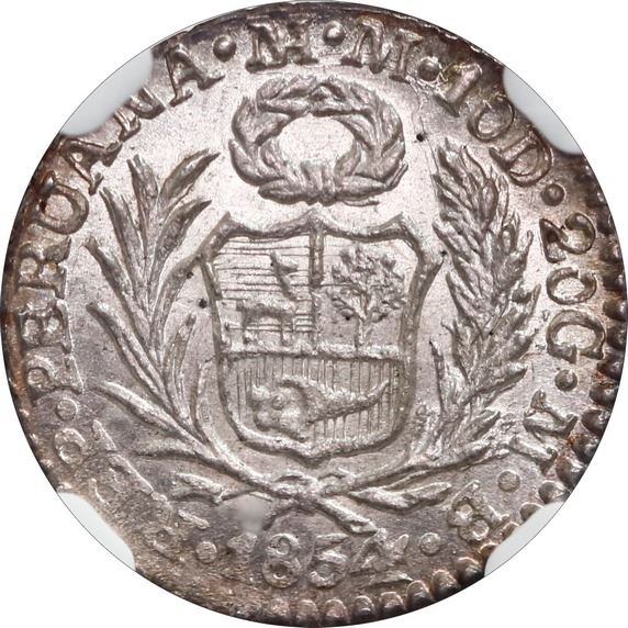 PERU, Lima, ½ real, 1854 MB, NGC MS 65, ex-O'Brien. KM-144.7. Excellent luster with light rainbow toning, parts of rims crude (as made) and with trace of die-clash on Liberty side, currently tied with two others for second finest in NGC census behind a single MS 66. Pedigreed to the John O'Brien Collection, with his tag.