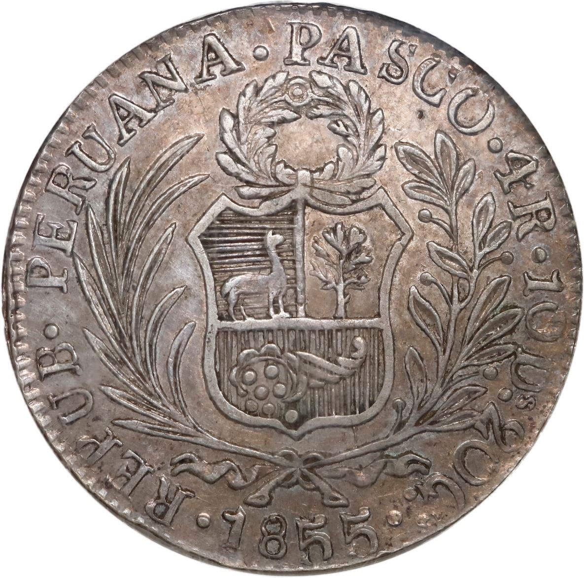 PERU, Pasco, 4 reales, 1855 (no assayer), mintmark PASCO, with REPUB• PERUANA, NGC AU 55, e