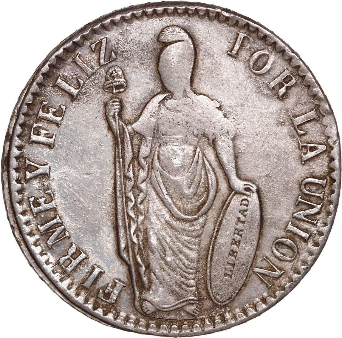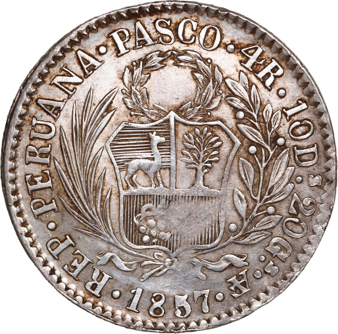 PERU, Pasco, 4 reales, 1857 AF, rare, NGC AU details / cleaned, ex-Flatt Plate, ex-Sellschopp, ex-O'Brien. KM-151.10. Bold strike and rims except for weakness on face and above date, nicely toned around details but with clearly hairlined obverse fields, rare assayer for this final date, notably missing in the Pat Johnson collection. Plate Coin in Flatt, pedigreed to the Sellschopp Collection (Swiss Bank Corp. auction of September 1988, lot 1240) and to the John O'Brien Collection (both stated on label), with his tag.