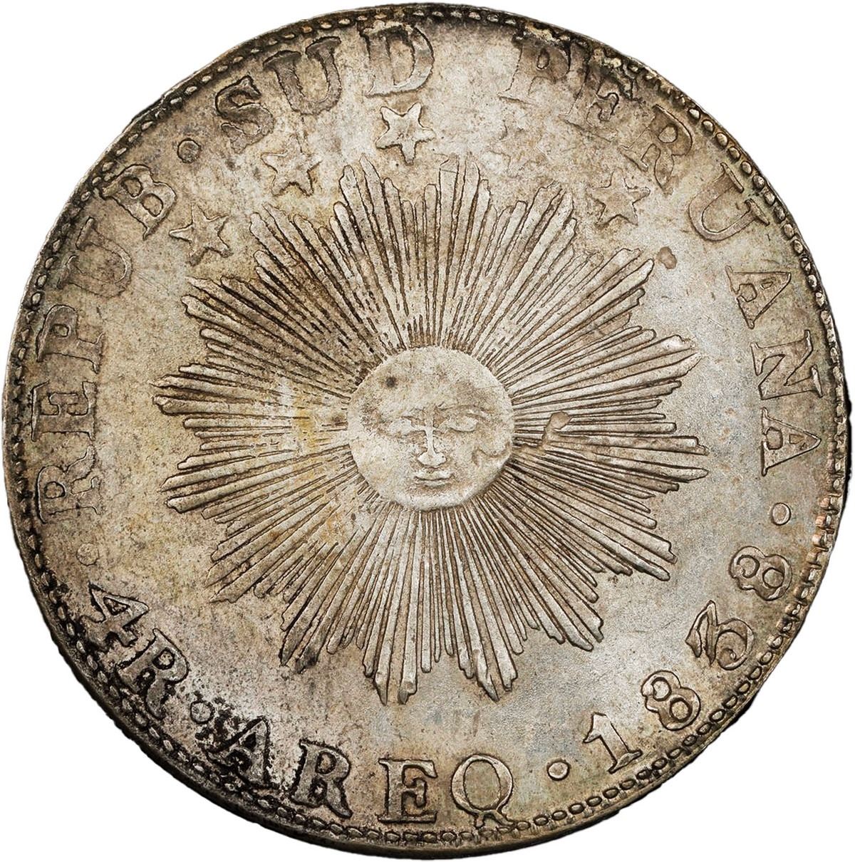 PERU (Republic of South Peru), Arequipa, 4 reales, 1838 MV, small date, PCGS AU details / cleaned, ex-Pat Johnson. KM-172. One-year type coin, fairly lustrous surfaces with very evidence for the cleaning designation beyond a few hairlines, lightly golden toned all over. Pedigreed to the Pat Johnson Collection (stated on label).