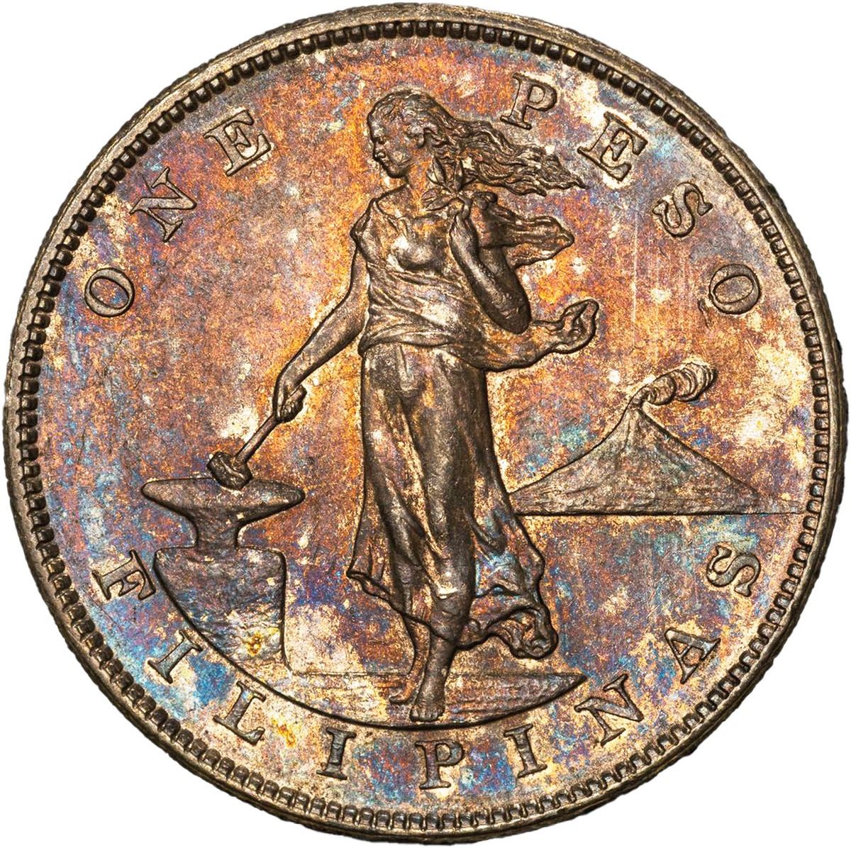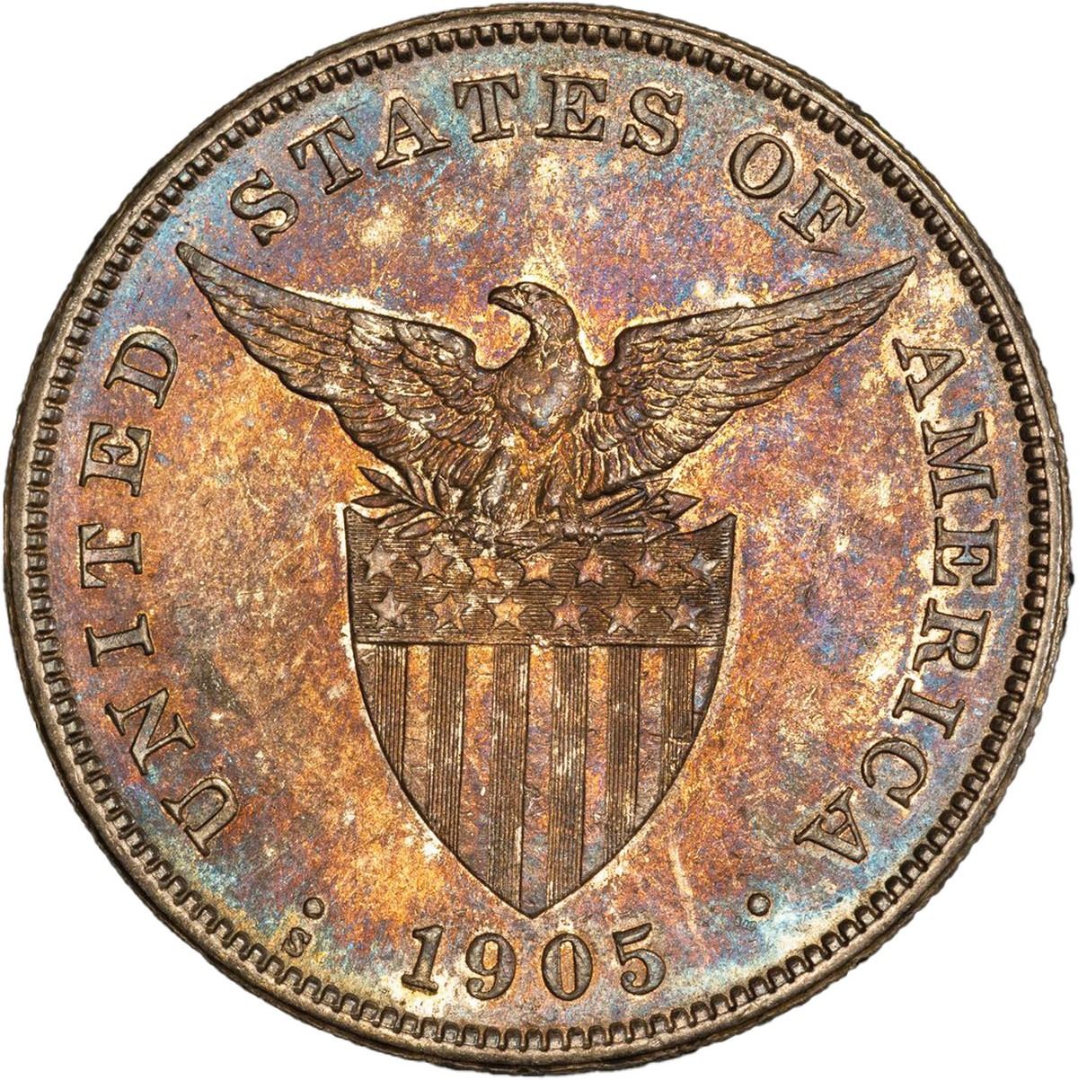 PHILIPPINES (U.S. administration), San Francisco Mint, 1 peso, 1905-S, straight serif, rare, PCGS MS62. KM-168; Allen-16.06a. The 1905-S straight serif peso is one of the rarest variants in its series and has long been considered a key piece in any serious Philippines peso collection. The triangular top of the 1 in the date is clear and denotes this important variety from the much more common curved serif type. Rare in any form, Mint State examples of this variety appear very infrequently on the market. Rich red and blue toning drapes the semi-lustrous surfaces; while close examination of the fields does show very minor marks, the overall appearance is a bit better than the numerical grade infers.