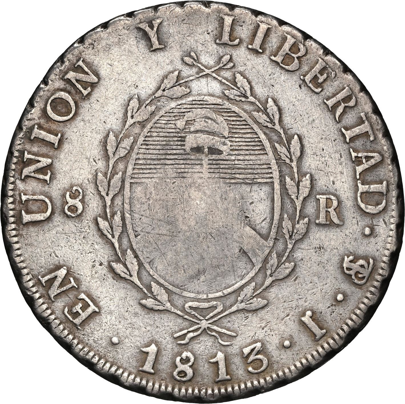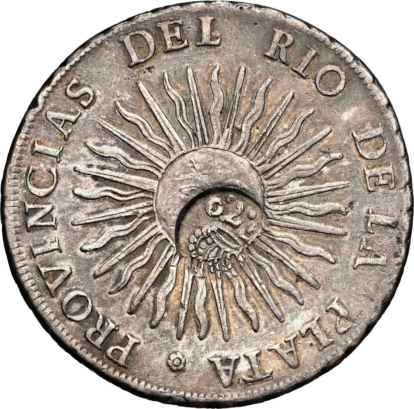 PHILIPPINES (under Spain), 8 reales, Ferdinand VII, crowned F.7.o countermark (Type V, 1832-4) on an Argentina (River Place Provinces), 8 reales, 1813 J, Potosí mint, rare, NGC XF 40 / c/s AU standard. KM-44.1; Cal-1305. Bold but uneven countermark, a bit offset from the central sunface of the host, which is lightly blue toned and undamaged save for some old hairlines on arms side, a choice example (second finest in the NGC census behind a single XF 45) of a rare and desirable combination in an extremely popular series.