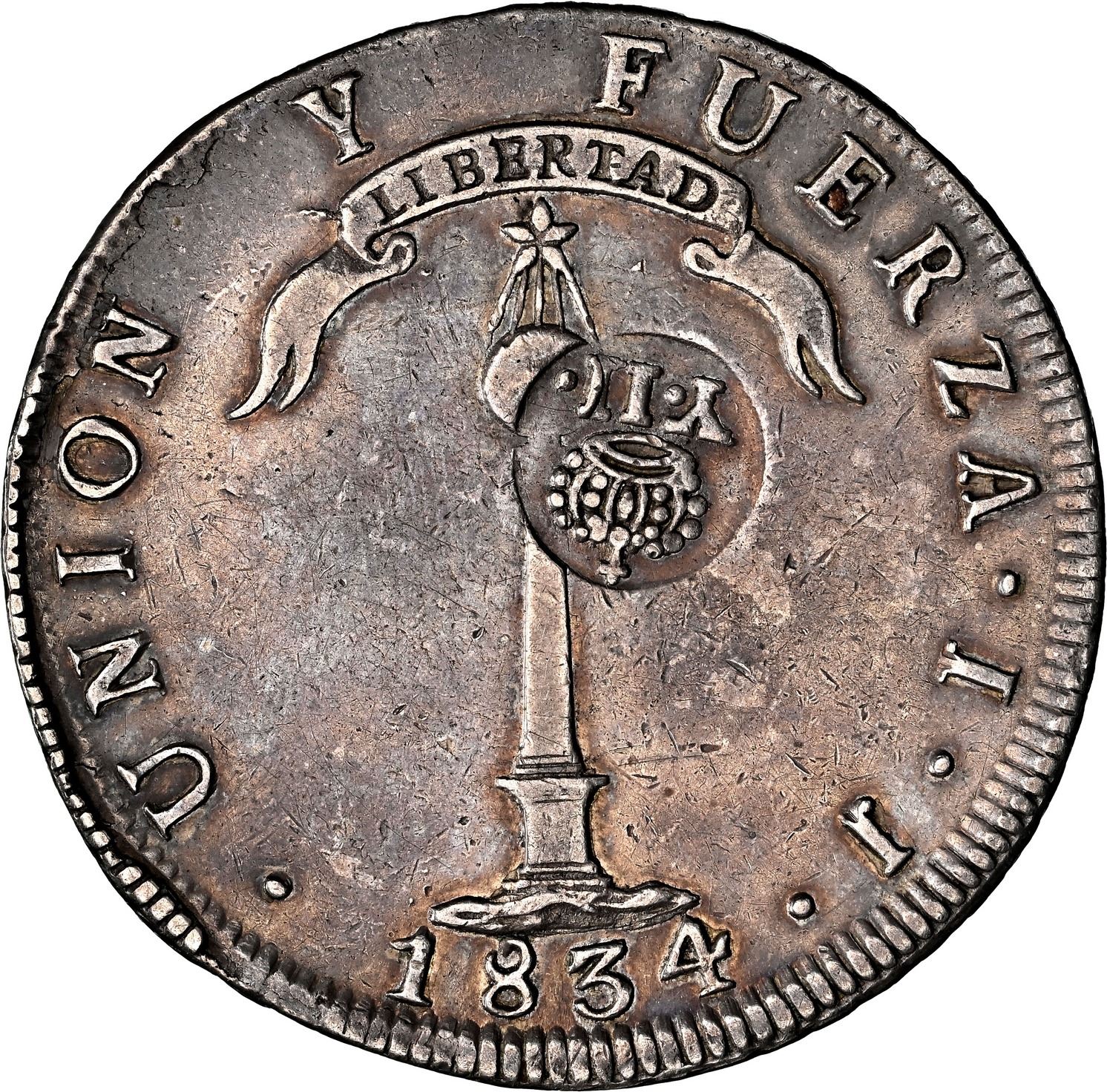 PHILIPPINES (under Spain), Manila, 8 reales, Isabel II, crowned-Y.II. countermark (Type VI, 1834-37) on a Santiago, Chile, "volcano" peso, 1834 IJ, NGC XF details / cleaned (c/s XF strong). Cal-668; KM-108. Beautifully toned and well-struck host with full countermark near top of column, leaving the iconic volcano design on other side intact, any cleaning done long ago.