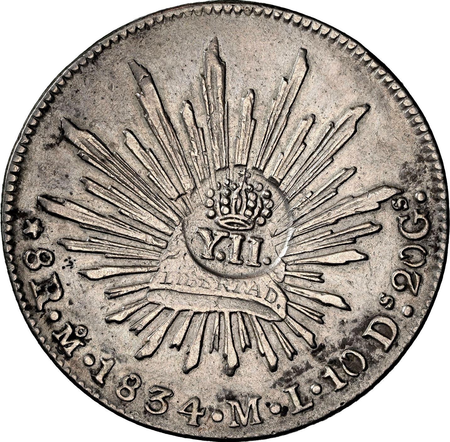 PHILIPPINES (under Spain), Manila, 8 reales, Isabel II, crowned-Y.II. countermark (Type VI, 1834-37) on a Mexico City, Mexico, cap-and-rays 8 reales, 1834 ML, NGC AU details / harshly cleaned (c/s AU strong), ex-Brameld. Cal-668; KM-unl (cf 129). Full and well-detailed countermark in center of cap, faintly toned over lightly cleaned surfaces (not "harshly") with small black spots here and there, this combination unlisted in KM. Pedigreed to the David Brameld Collection.