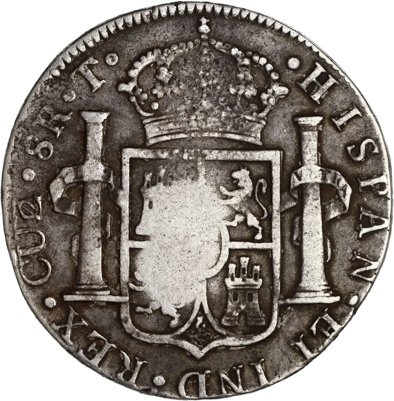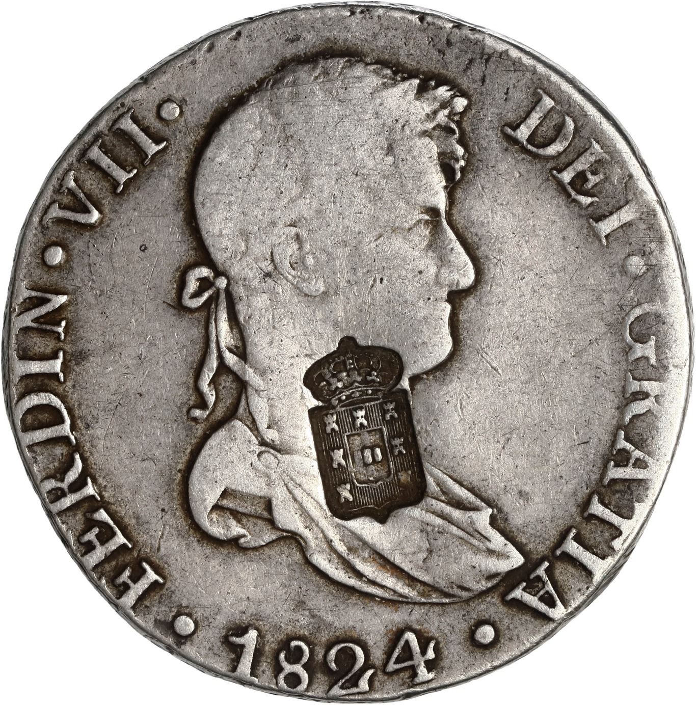 PORTUGAL, 870 reis, Maria II, crowned-arms countermark (1834) on a Cuzco, Peru, bust 8 reales, Ferdinand VII, 1824 T, very rare, ex-Brameld. Gomes-unl (Type 29); KM-unl (440 for type). 26.96 grams. Bold and deep XF countermark on neck of bust of richly toned Fine host with weak rims (as made) from the scarce one-year Cuzco mint issue (KM-117.2), this combination unlisted in references and we cannot trace another example. Pedigreed to the David Brameld Collection.
