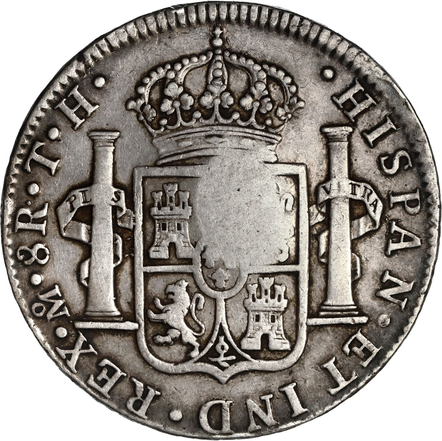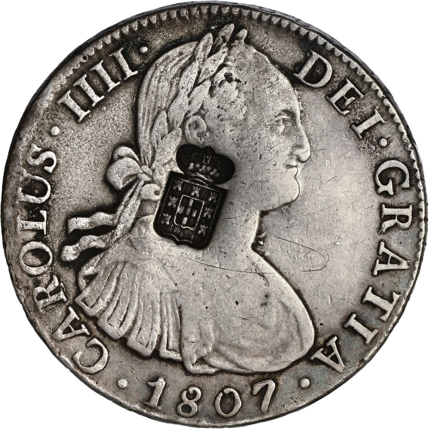 PORTUGAL, 870 reis, Maria II, crowned-arms countermark (1834) on a Mexico City, Mexico, bust 8 reales, Charles IV, 1807 TH, ex-Brameld. Gomes-27.44; KM-440.13. 26.67 grams. Deeply impressed XF countermark in center of bust of VF host with nice toning all over, cleaned long ago and with light oval scratch in center of obverse. Pedigreed to the David Brameld Collection.