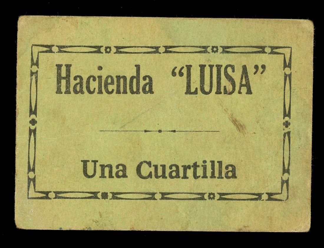 PUERTO RICO, Hacienda Luisa, paper 1 cuartilla, circa 1890s, very rare, ex-Roehrs, ex-Rudman. The Hacienda Luisa was founded in the mid-1800s by Don Francisco José Brunt Urgell who immigrated from Catalunya. He named the sugar plantation after his wife, Luisa Guayta Munté. In 1880, Don Francisco died. Eight years later, Luisa Guayta remarried local sugar proprietor Fidel Benero Rivera. In 1890, Luisa Guayta's son José Brunet Guayta took over the plantation and upgraded its machinery to vastly increase its production of brown granulated sugar. It was around this time that these notes were printed to pay the plantation workers. This uniface note, printed on green cardstock, has Hacienda "LUISA" at top and Una Cuartilla below with simple border all around. Very Fine with bold printing, very rare. Pedigreed to the Edward Roehrs Collection and to the Isaac Rudman Numismatic Cabinet.