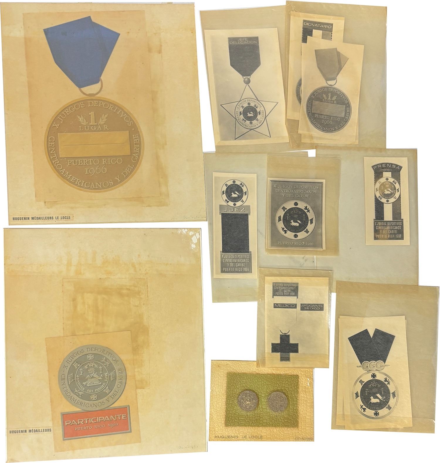PUERTO RICO, portfolio of designs by the Swiss company Huguenin for medals for the tenth Central American and Caribbean Games held in San Juan in 1966. Interesting series of twelve photographic proofs for various medals awarded throughout the games ranging from the 1st place prize, participants, administration and medical staff, and head delegate medals. Also with the lot is a mockup medal design for the fourth Inter-American Skeet Tournament held in Puerto Rico in 1960.
