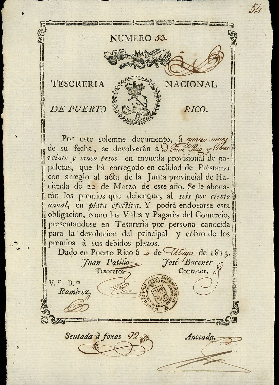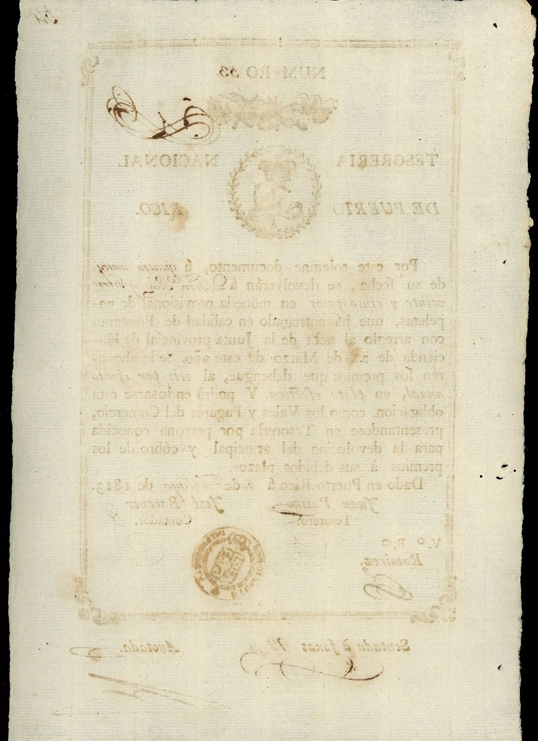 PUERTO RICO (under Spain), Tesorería Nacional, 25 pesos, 4-5-1813, serial 53. Pick-unlisted. About 8¼" x 12¾". A large, uniface fiscal document numbered 34 promising to pay Don Francisco Puig y Gibert the sum of 25 pesos in provisional money one year from the date of May 4, 1813, with interest at an annual rate of 6% (basically a 19th-century promissory note or certificate of deposit), signed by Treasurer Juan Patiño and Accountant José Bacener and countersigned (V.o B.o) by [Alejandro] Ramírez. Rare and important as effectively the first currency of Puerto Rico, issued while Ferdinand VII was king of Spain. Nice AU with great ink color and paper quality, a few small holes in the left margin.