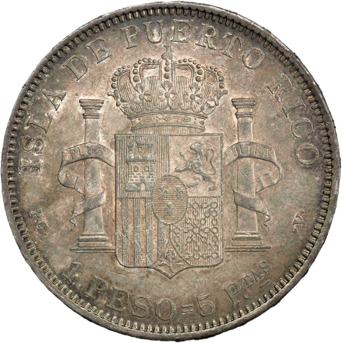 PUERTO RICO (under Spain), struck at the Madrid Mint, 1 peso, Alfonso XIII, 1895 PG-V, PCGS AU55.