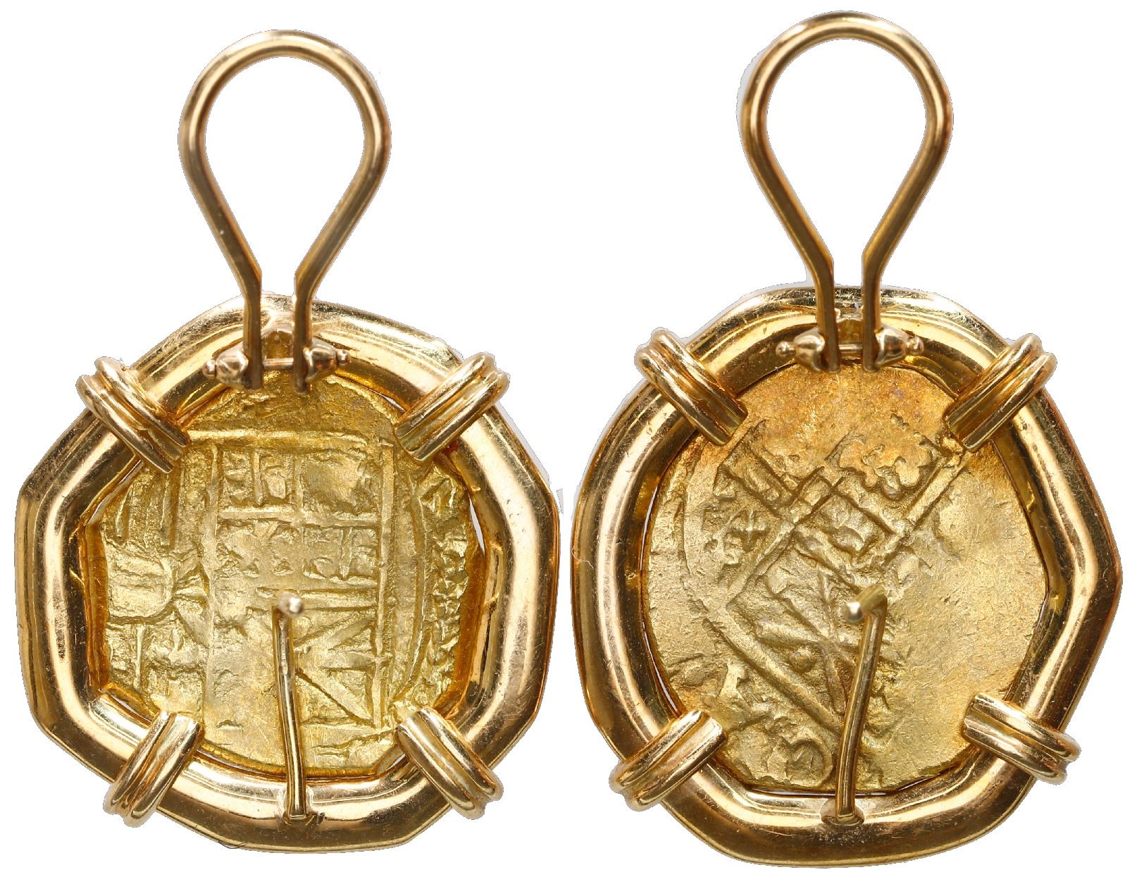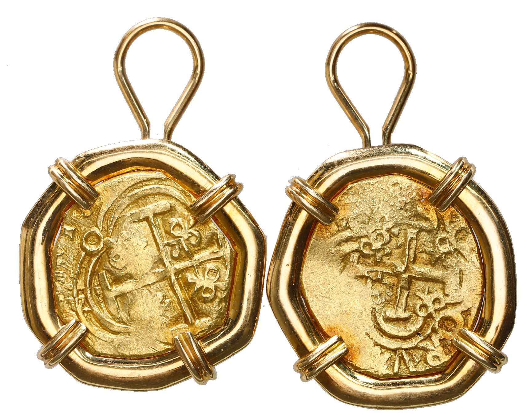 Pair of Bogota, Colombia, cob 2 escudos, posthumous Charles II, no assayer (Arce), ex-1715 Fleet, mounted cross-side out in 14K gold earrings. 29.80 grams total. Nearly full shields and crosses, both AU with flat spots, in hefty post-and-clip mountings that make for an impressive set, great retail item. From the 1715 Fleet, with original Fisher photo-certificates #10442 and NCB3127MO and Sedwick photo-certificate.