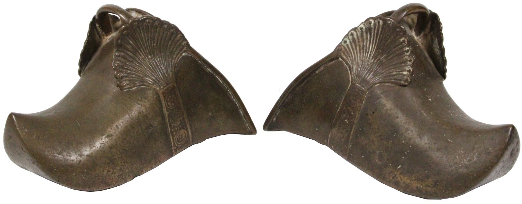Pair of Spanish colonial cast brass stirrups (estribos), 1700s. 2226 grams total, each about 8-1/2" x 4". Basically backless brass shoes, with pointed and upturned toes, peacock-feather design on either side of latch-bar on tops, triangular holes in bottom, worn and partially patinated but intact save for one small split in back of one stirrup. With photo-certificate.