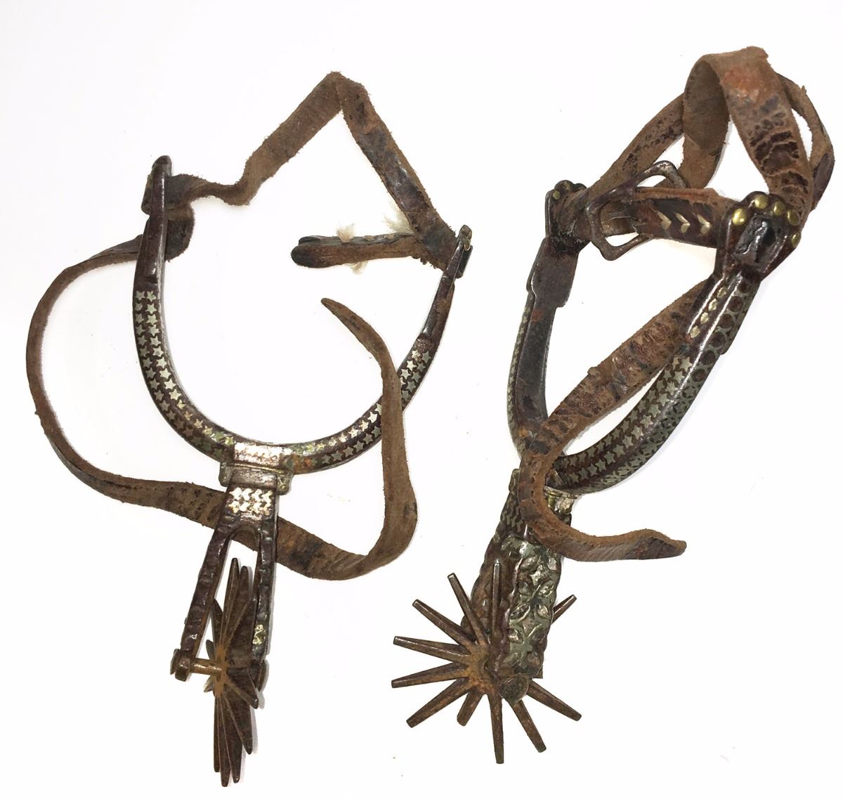 Pair of Spanish colonial inlaid silver spurs (espuelas), 1700s-1800s. 476 grams, 6-1/2" long, 3-1/2" wide. Fine pair of early iron spurs with intricate silver inlays, original old leather straps with buckle intact on one, good original condition except that each spur has several points missing from rowel due to use. With photo-certificate.