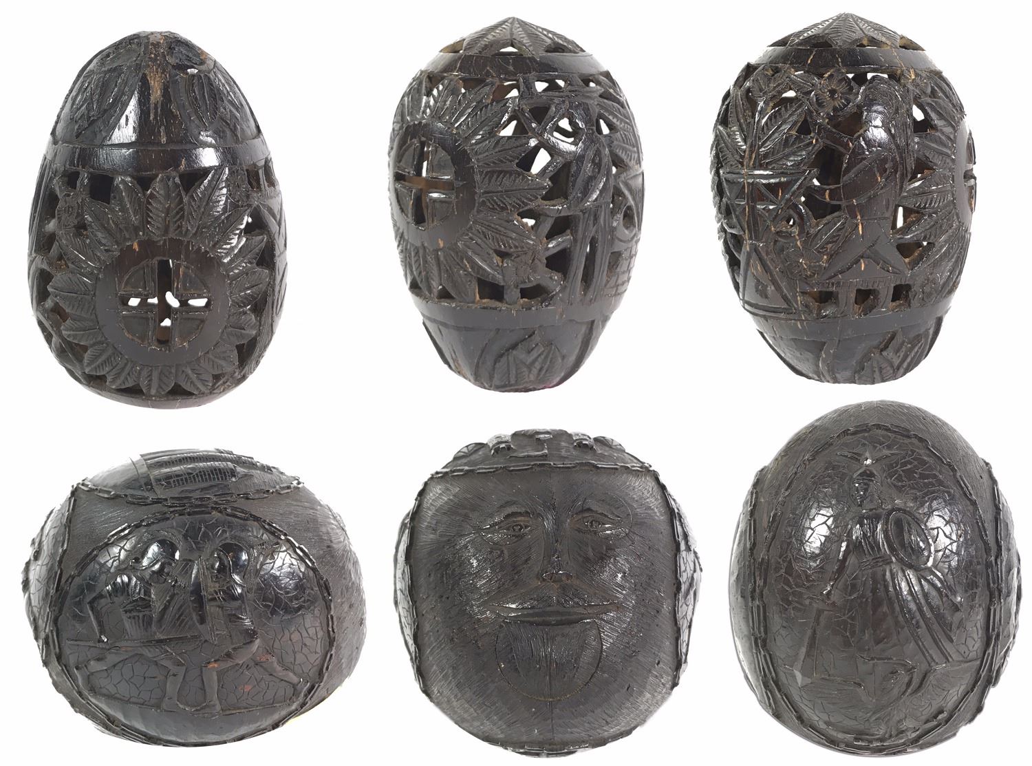 Pair of carved coconut shells, 1700s, rare. 214 grams total, 4-1/2" and 5" in length. Two ornately carved coconuts, each with different scenery and purpose but both with humorous carved faces at one end. One is a solid piggy bank with coin slot on top and carved medieval scenes of knights, castles, sword fighting on horseback and a mustachioed gentleman on one end. The other contains pierced primitive carvings of tropical scenery: palm trees, leaves, natives, flowers, a cross on top, and a fish face on one end. Ex. Glenn and Wilman Tripp Estate Trust in July 2001 Butterfield Auction.