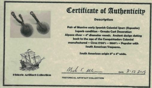 Pair of large, early Spanish colonial spurs (espuelas), 1700s. 1058 grams total, 8" x, 4" each. Alpaca or low-grade South American silver spurs widely used by vaqueros with a design dating back to the conquistadors. Dull finish (perhaps cleaned but not polished), excellent overall condition. With photo-certificate.