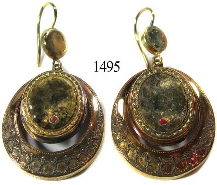 Pair of large, low-grade gold earrings. 10.8 grams total, each about 2" x 1-1/8". As 19th-century "costume jewelry" these earrings were made of low-grade gold in fairly simple design, with raised oval panel inside crescent shape, spot of red enamel near bottom of oval, with small, round, separate panel at top attached to shepherd's crook (for pierced ears), all intact but obviously salvaged. Recovered from: General Abbatucci, sunk in 1869 off Corsica. With original Christie's (London) lot-certificate #77 from 1997.