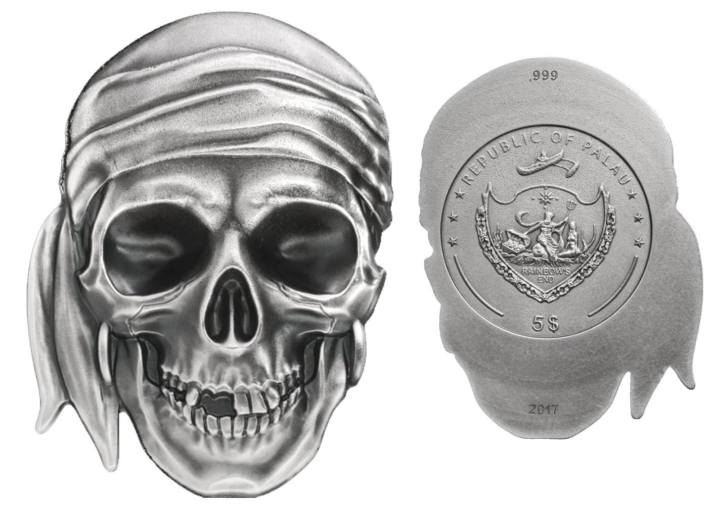 Palau (struck by Coin Invest Trust), $5, 2017, 3-D pirate skull with bandanna, antique finish, PCGS