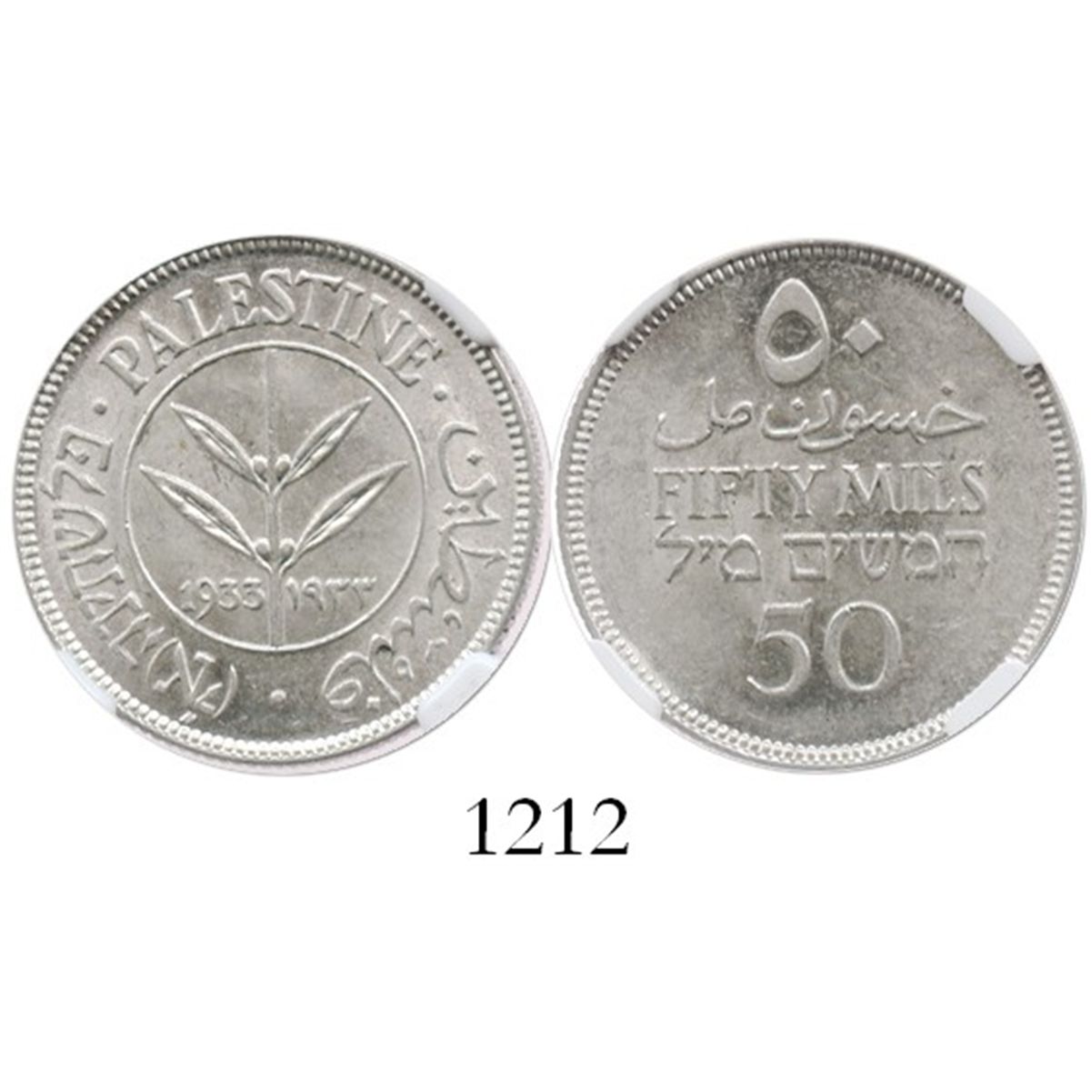 Palestine, 50 mils, 1933, encapsulated NGC AU 58. KM-6. Bright and lustrous, just too many bagmarks in fields to make Mint State.