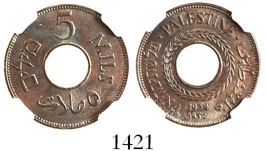 Palestine, copper-nickel 5 mils, 1934, encapsulated NGC MS 62. KM-3. Rosy copper color all over, no wear or hairlines but a couple tiny marks.
