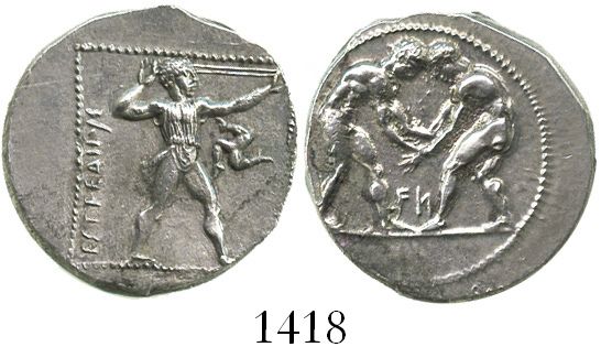 Pamphylia, Aspendus (Balkyzi), AR stater, ca. 380/75 to 330/25 BC. Tekin series 4; SNG BN-99 (same dies). 10.7 grams. Two wrestlers facing one another, grappling; between, FN (N retrograde) on obverse; reverse with slinger in throwing stance right; in right field, triskeles; all within pelleted square border. Lustrous and lightly toned AU, off-center strike but nice details.