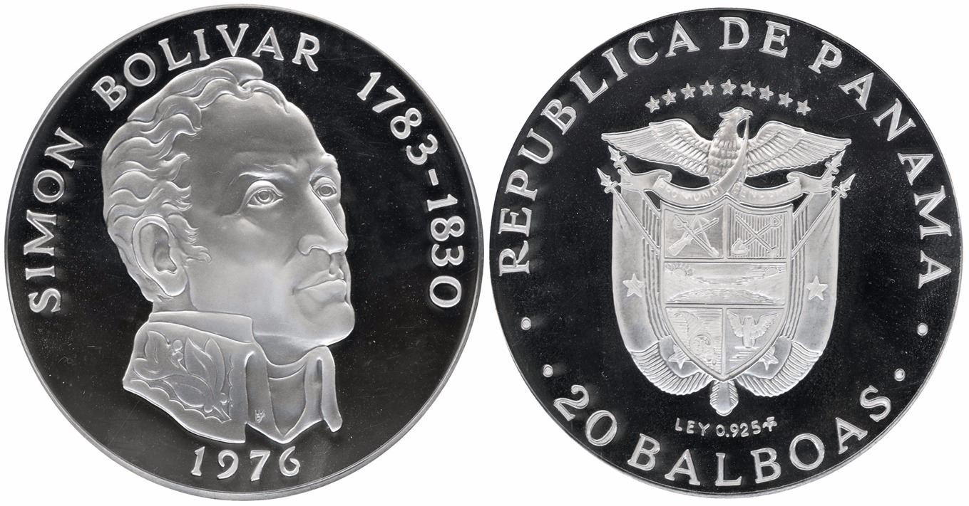 Panama, 20 balboas, 1976, Simon Bolivar, encapsulated NGC PF 69 Ultra Cameo (extra large slab), finest known in NGC census. KM-31. 129.59 grams A massive and essentially perfect beauty whose only apparent flaw (keeping it from PF 70) is a tiny mark at the bottom of the shield, with all fields deeply mirrored and the details frosty and choice, significant as among the seven submissions currently in the NGC census (all Ultra Cameo) this is the ONLY PF 69. NGC #4422861-001.