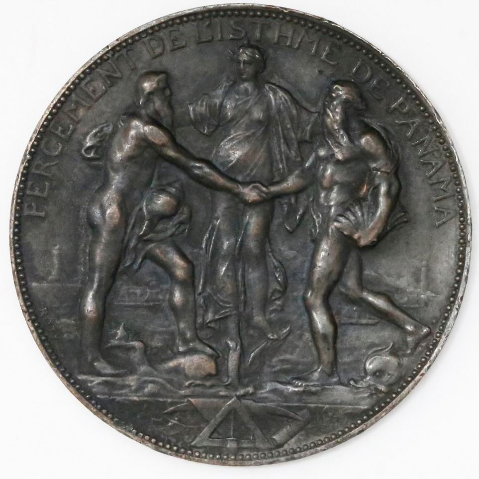 Panama (France), bronze medal, 1880, French Panama Canal Construction Commencement, ex-Rudman. Plowman-CM5.1. 16.20 grams, 1-1/4" Engraved by famous French medalist Louis-Oscar Roty and issued to those who had purchased a certain amount of French Canal Company stock. Obverse: woman bringing together personifications of the Pacific and Atlantic Oceans, lighthouses and steamers in background, fish and drafting tools at bottom, legend above reads PERCEMENT DE L'ISTHME DE PANAMA; reverse: CANAL / DE PANAMA / COMPAGNIE UNIVERSELLE / DE CANAL INTEROCEANIQUE / 7 8 ET 9 DECEMBRE 1880 / A SES SOUSCRIPTEURS / LA BANQUE / PARISIENNE. Darkly toned XF+ with a few minor rim nicks. Pedigreed to the Isaac Rudman collection.