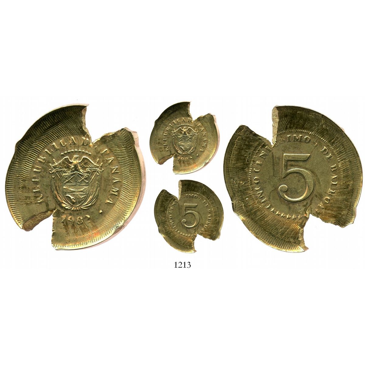 Panama, piedfort die-trial 5 centesimos, 1982, struck on oversized gold planchet, very rare.