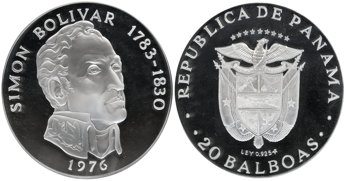 Panama (struck in Philadelphia), 20 balboas, 1976, Simon Bolivar, NGC PF 69 Ultra Cameo, tied with o