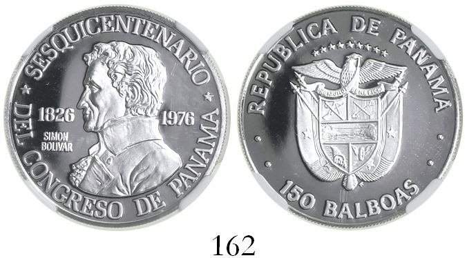 Panama (struck in Philadelphia), proof platinum 150 balboas, 1976, Sesquicentennial of the Congress of Panama, encapsulated NGC PF 69 Ultra Cameo. KM-43. Gorgeous mirror fields and frosty details, totally devoid of any marks or flaws to our eyes, with elegant portrait of Simon Bolivar on obverse.