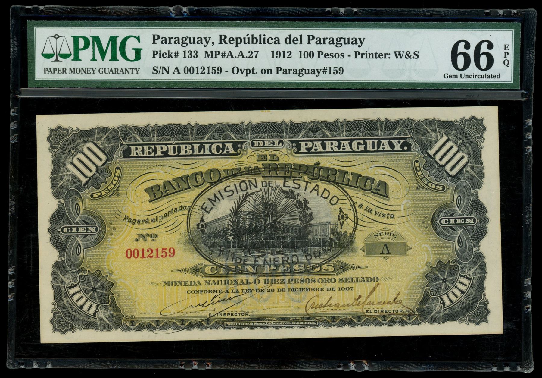 Paraguay, Republica del Paraguay, provisional 100 pesos, 26-12-1907, serial 0012159, with black oval overprint dated 11-1-1912, with Junta Fiscalizadora overprint on back, PMG Gem UNC 66 EPQ, "top pop." SCWPM-133; MP-A.A.27. Well centered design with good margins, great paper quality with substantial paper wave and embossing visible. Tied with two others for finest known in the PMG census.