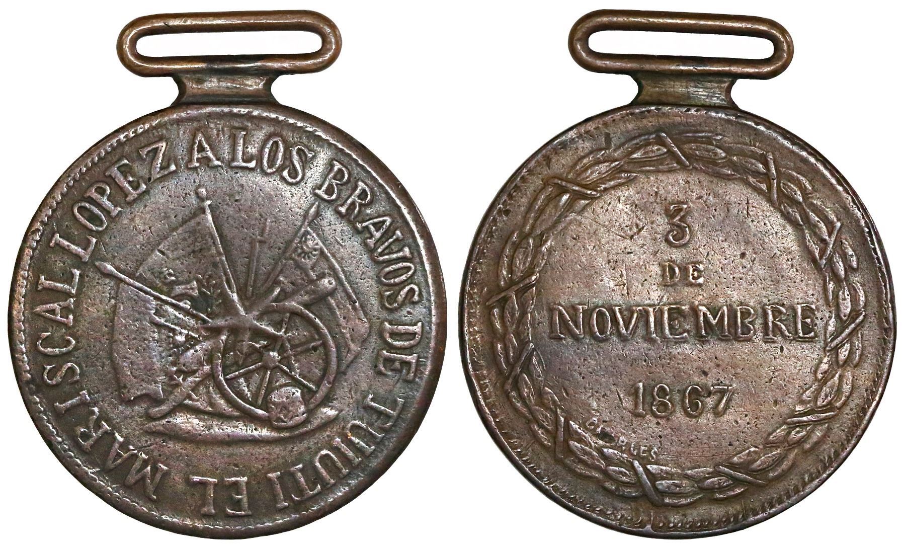 Paraguay, bronze military medal, 1867, Battle of Tuyuti. Pratt-CP17. 19.82 grams; 34 mm. Obverse: cannon in carriage and flags within legend EL MARISCAL LOPEZ A LOS BRAVOS DE TUIUTI; reverse: 3 / DE / NOVIEMBRE / 1867 within wreath. Choice XF with only minor surface chatter, with original hanger loop at top, chocolate brown toning all over.