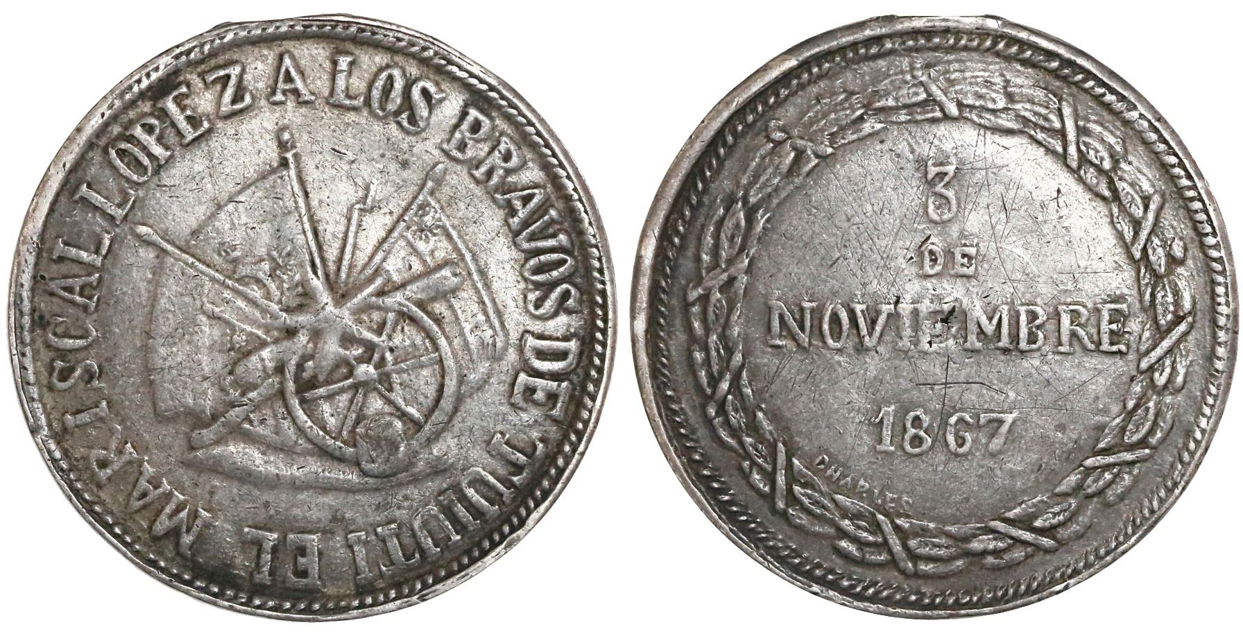 Paraguay, silver military medal, 1867, Battle of Tuyuti, rare. Pratt-CP16. 13.65 grams; 35 mm. Obverse: cannon in carriage and flags within legend EL MARISCAL LOPEZ A LOS BRAVOS DE TUIUTI; reverse: 3 / DE / NOVIEMBRE / 1867 within wreath. VF with hanger loop removed, another crude type with somewhat weak definition yet understandable given the circumstances at the time in Paraguay, some old marks on surfaces, mostly a dark silver color with a few spots of dark color. Unpriced and noted as rare in Pratt.