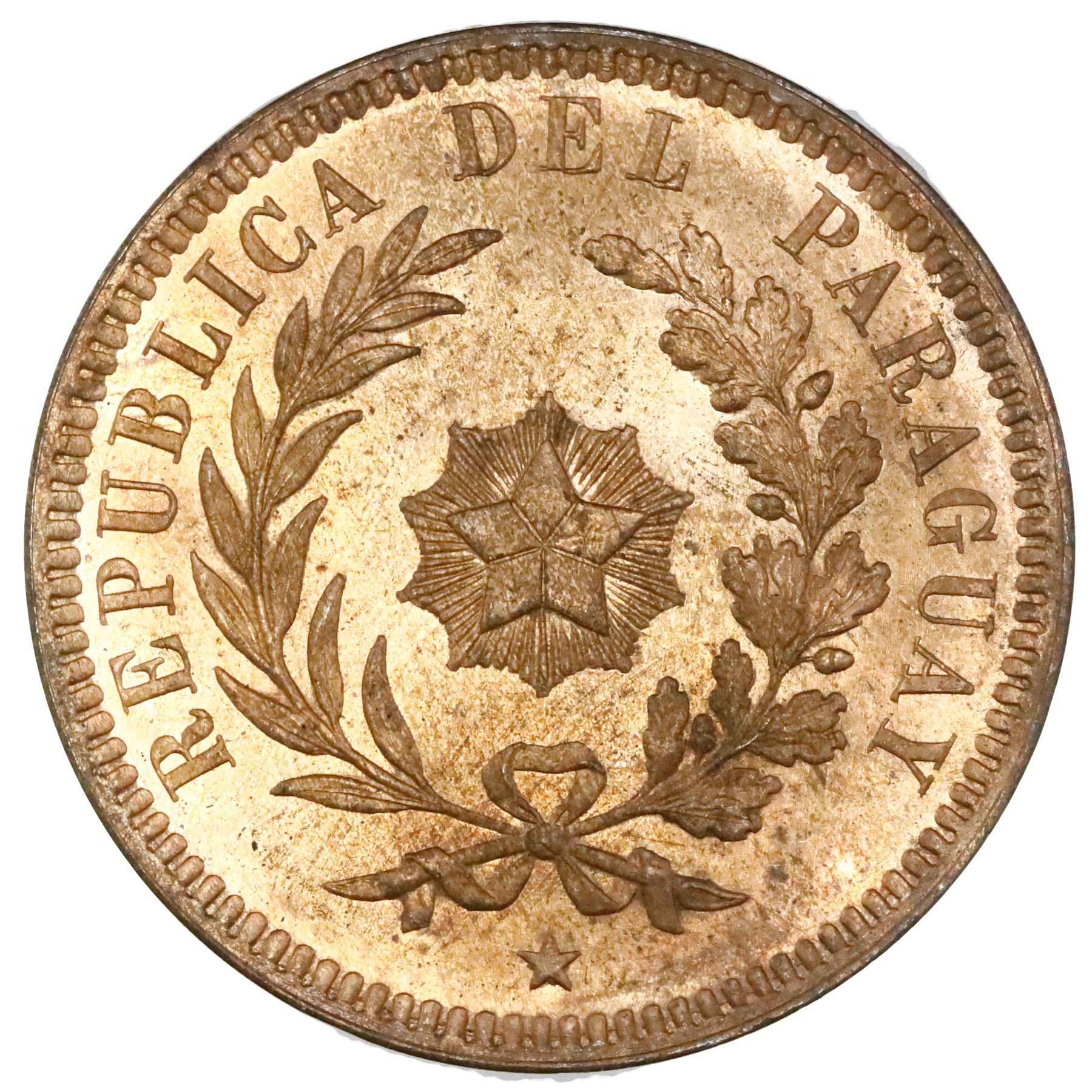 Paraguay (struck at the Heaton mint, England), specimen copper 2 centesimos, 1870-SHAW, PCGS SP64RB. KM-3. Light red-brown surfaces with muted luster. Pedigreed to the Heaton Mint Archives. PCGS #39626566.