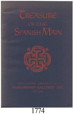 Parke-Bernet Galleries (New York), Treasure of the Spanish Main, February 4, 1967, rare and in demand. One of the earliest and most important sales of Spanish colonial gold and silver cobs, gold jewelry, porcelains, ammunition, and silver bars and clumps recovered from the 1715 Fleet wrecks by the Real Eight Co., with many photos (Fine condition).