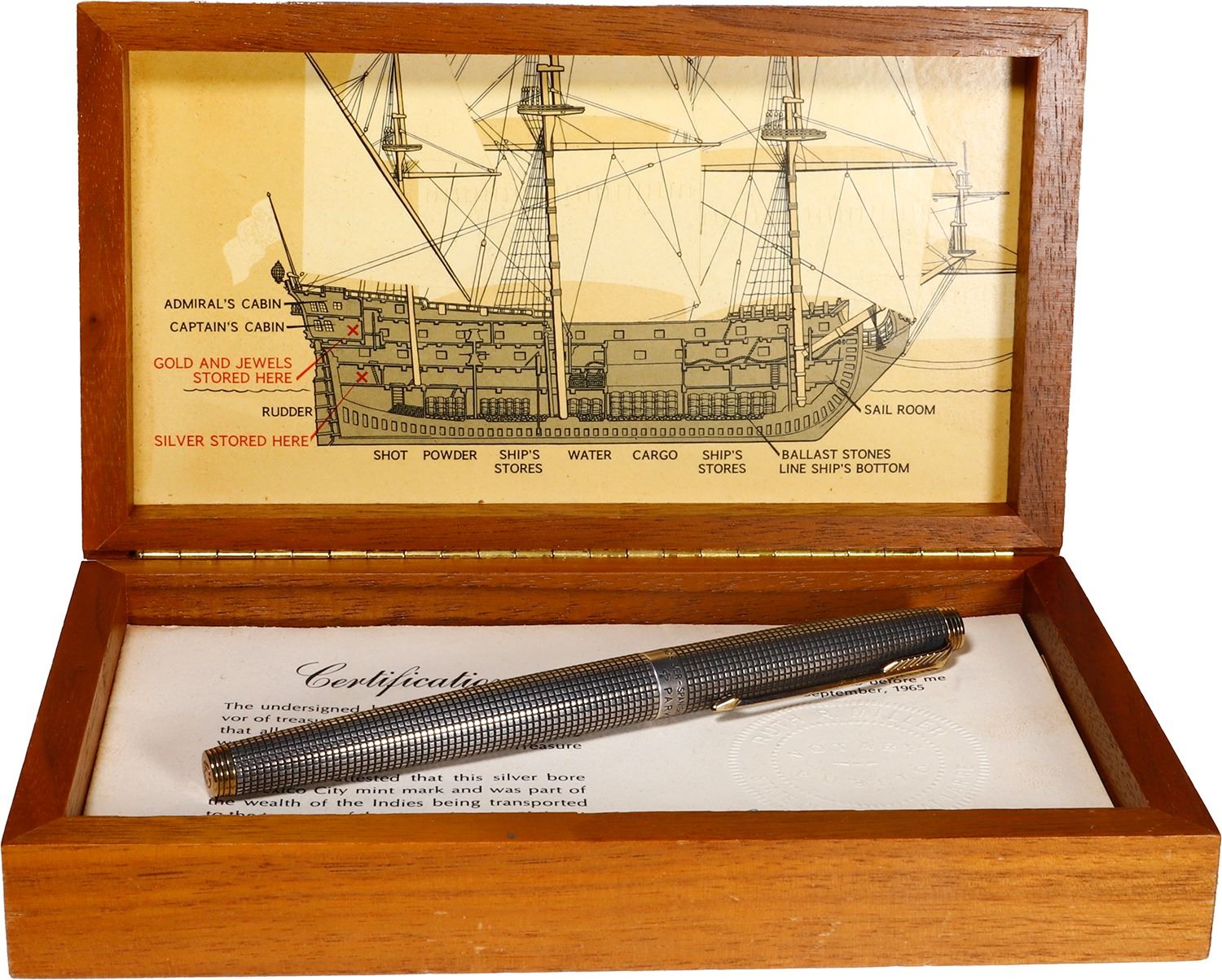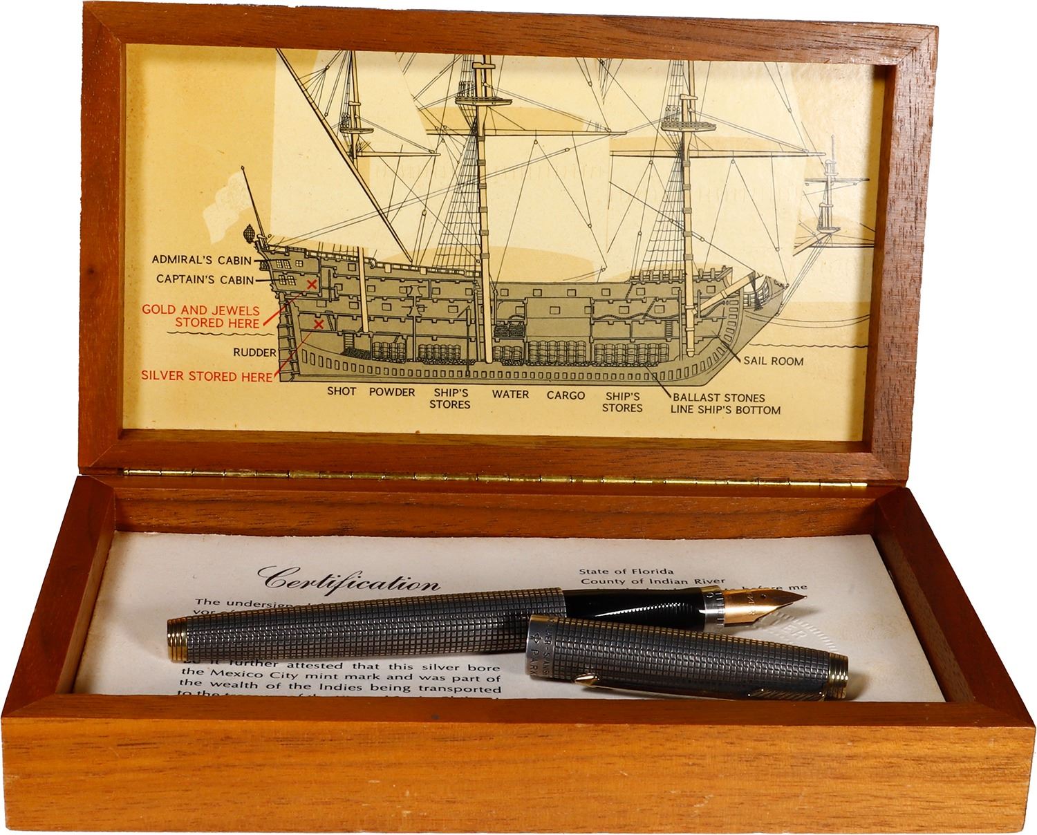 Parker 75 fountain pen made in 1965 from 1715 Fleet silver, in original presentation box. Box: 6-5/8" x 3¾" x 1½". As mentioned in his book Pieces of Eight, Kip Wagner's Real Eight Co. was badly in need of money when investor Ken Parker came forward with the idea to melt down 4,000 oz. of silver cobs from the 1715 Fleet and turn them into popular fountain pens (limited to 4,821 units) to sell at $75 each (triple the normal retail price for their pens), a small fortune in 1965 for anyone but wealthy executives. But it is not just the pen that makes these collectibles valuable: You have to have the whole package, with the box and certificates and booklets. This offering has it all, including the green-felt pouch that is often missing. The pen itself shows the customary Parker 75 crosshatch pattern on the outside but with the all-important "SPANISH TREASURE FLEET - 1715" embossed around the center and also with the oM mintmark for Mexico and the Mexican eagle in the gold accents at either end. (For more information, see http://www.parker75.com.). With original hinged box that shows a map on top, a diagram of a galleon inside, inspection certificate/guarantee 79914 , small booklet, and a notarized certificate with Kip Wagner signature.