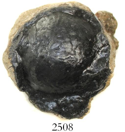 Partially encrusted small iron cannonball ("4 pounder"). 3 lb 13 oz, 3-1/2" in diameter. Thickly cocooned ball with about 1/3 of its surface exposed and professionally conserved (matte black), a unique and interesting display. From the Spanish 1733 Fleet, Florida Keys, with salvager's certificate #8826.