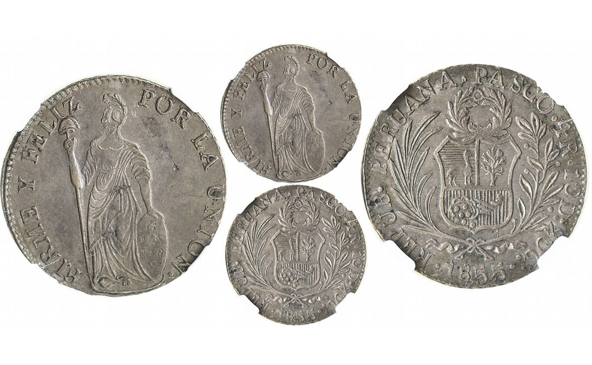 Pasco, Peru, 4 reales, 1855, "REPUB" variety, no assayer, encapsulated NGC AU 58, finest known specimen graded by NGC. KM-151.8. Deeply toned with underlying luster, nice strike for the type but with a couple minor flan flaws, scarce one-year type.