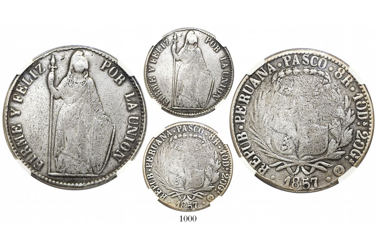 Pasco, Peru, 8 reales, 1857, Z inside O, encapsulated NGC Fine details / mount removed, repaired, extremely rare, ex-Sellschopp. KM-142.13. Well toned (especially dark around letters of legend) but weak and worn in centers and with lots of tiny marks, also with tooling at top from mount-repair, but overall quite competent for a one-year type that is missing in most Peruvian collections and catalogs for $25,000 in XF grade. Pedigreed to the Sellschopp collection.