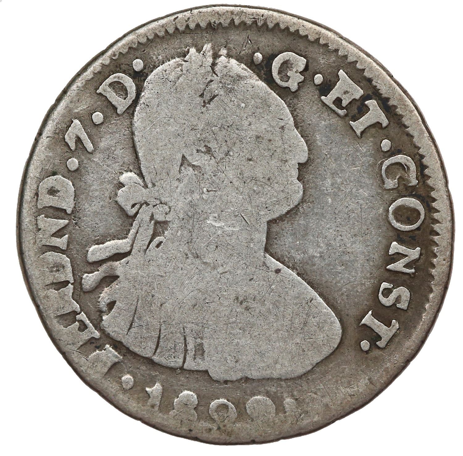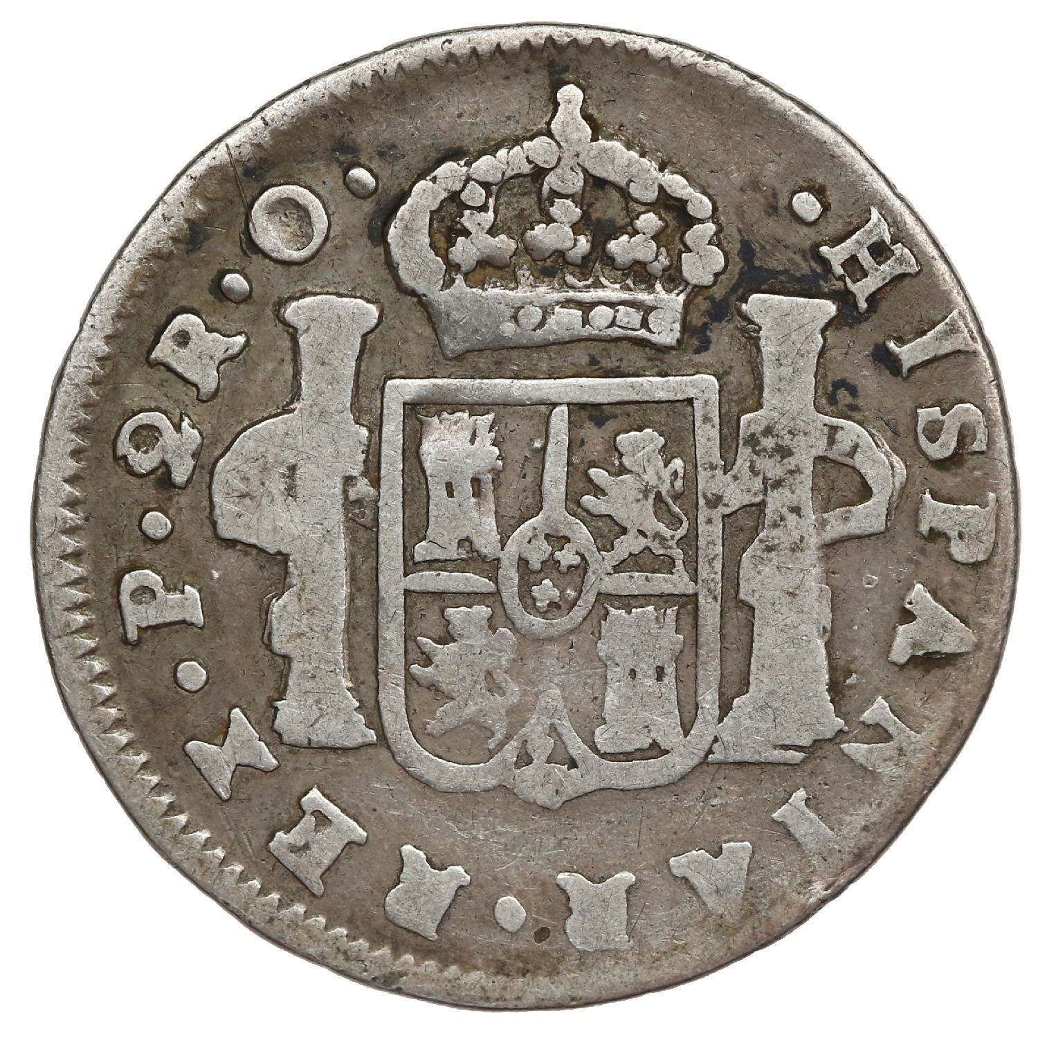 Pasto, Colombia, bust 2 reales, Ferdinand VII (bust of Charles IV), 1822 O, two dots between date an