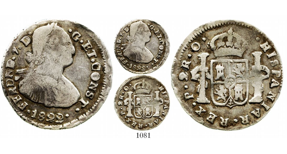 Pasto, Colombia, bust 2 reales, Ferdinand VII (bust of Charles IV), 1822O. KM-74; Restrepo-115.1; CT-973. 6.4 grams. Bold but typically crude AVF with nicely toned legends, off-center strike, old scratches on bust, unusually well detailed for this interesting single-date, single-assayer issue from a revolutionary-era Royalist mint, also distinctive as the only New World issue to mention the new Spanish Constitution in the legend. Jorge Ortiz Murias collection of Colombian colonial minors.