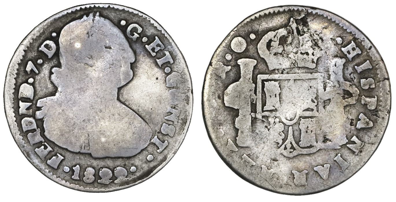 Pasto, Colombia, bust 2 reales, Ferdinand VII (bust of Charles IV), 1822O, two dots between date and