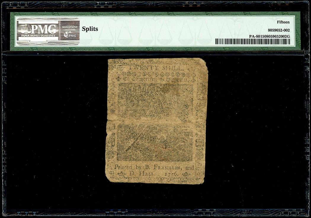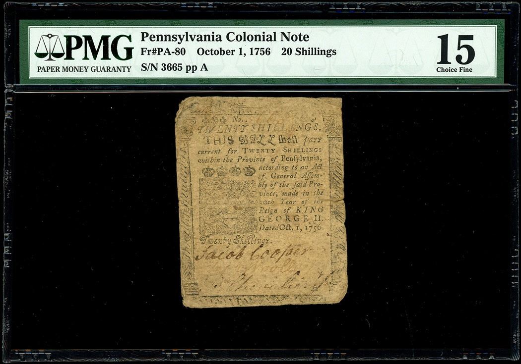 Pennsylvania, 20 shillings, Oct. 1, 1756, serial 3665, plate A, printed by Benjamin Franklin, PMG Fine 15, finest and only known example in PMG census. Fr-PA-80. Another example of the ever-popular Benjamin Franklin printed colonial issues, this being the highest denomination made for the series. Like most early colonial bills, this note was heavily circulated and has, as PMG notes, splits which are rather light and located at the central horizontal fold. Both sides retain significant ink color with penned serial and signatures still visible. Considerably better than both examples from Eric P. Newman's collection. PMG #8059652-002. Pedigreed to the Henry D. Osborne collection.